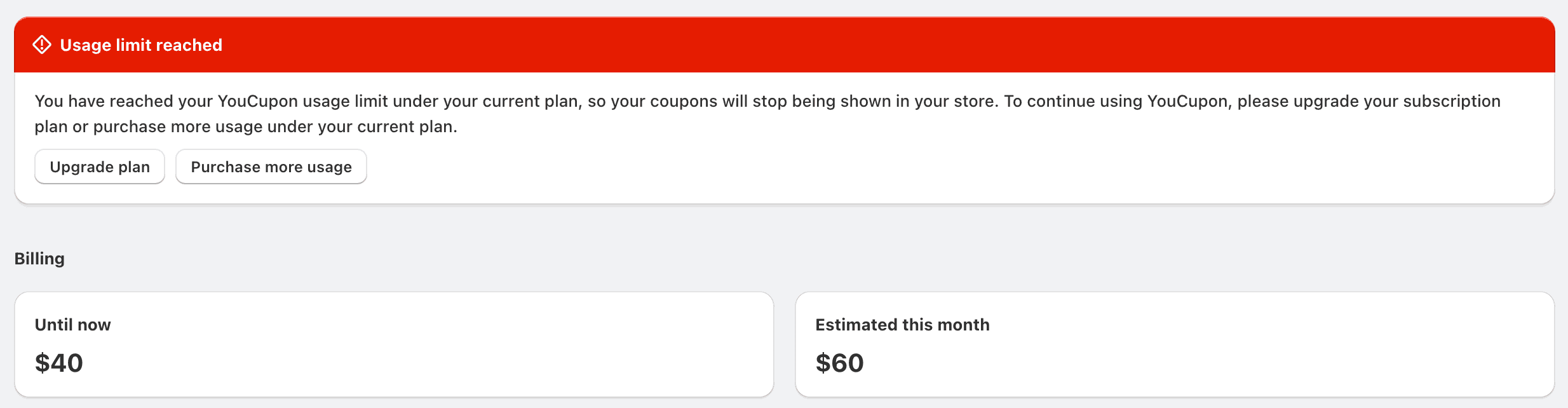 Each subscription plan comes with its own usage limits. If you exceed your plan’s limit, YouCupon services will be temporarily suspended to prevent additional charges.